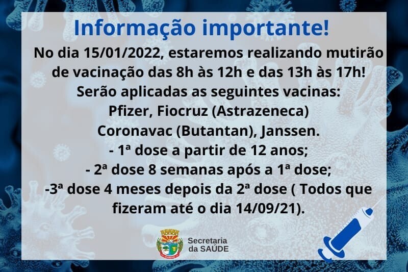 Neste sábado, dia 15/01/22, estará realizando um mutirão de vacinação, no horário das 8h às 12h e das 13h às 17h.