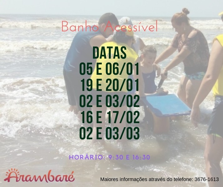 Banho acessível na praia de Arambaré nos dias 05, 06, 19 e 20 de janeiro, 02, 03, 16 e 17 de fevereiro e 02 e 03 de março de 2019.