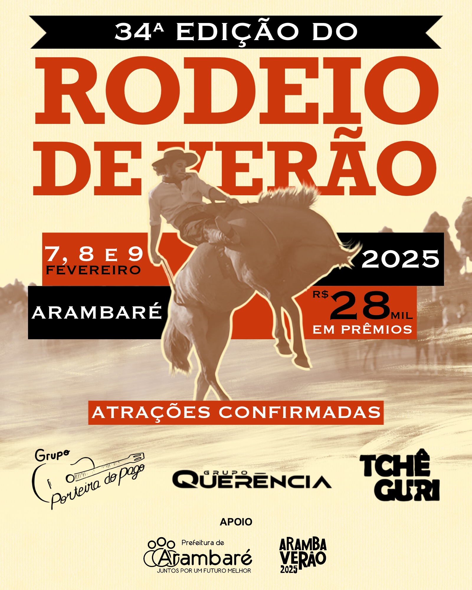 A cidade de Arambaré está pronta para mais grande evento: a 34ª edição do Rodeio de Verão, que será realizada nos dias 7, 8 e 9 de fevereiro de 2025. O evento, que já é uma tradição na região, promete movimentar a cidade com muita cultura, música e disputas emocionantes.