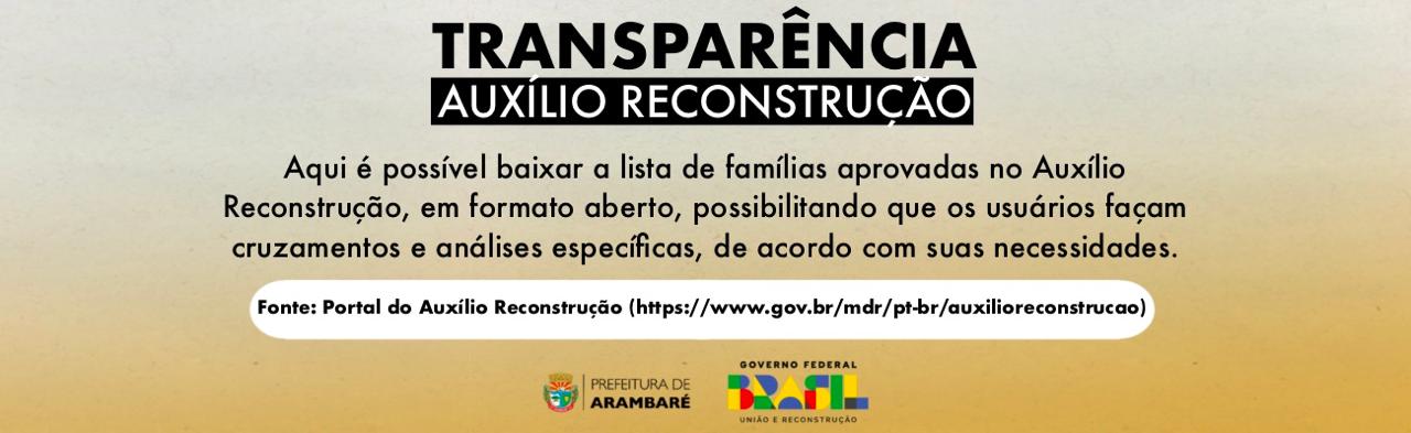 Visando promover a maior transparência em relação ao Programa Auxílio Reconstrução, a Prefeitura Municipal de Arambaré, disponibiliza informações pertinentes sobre os cadastros enviados ao Governo Federal, assim, de forma recorrente, estas informações serão atualizadas. Os arquivos são disponibilizados em formato CSV, de forma mensal.